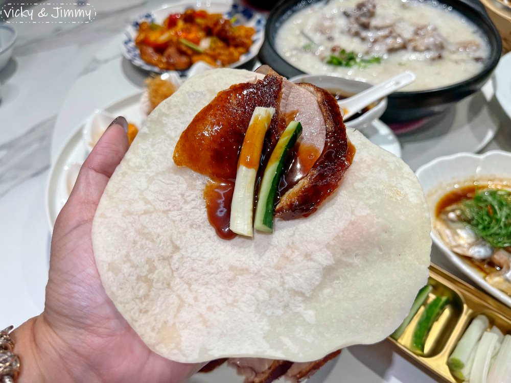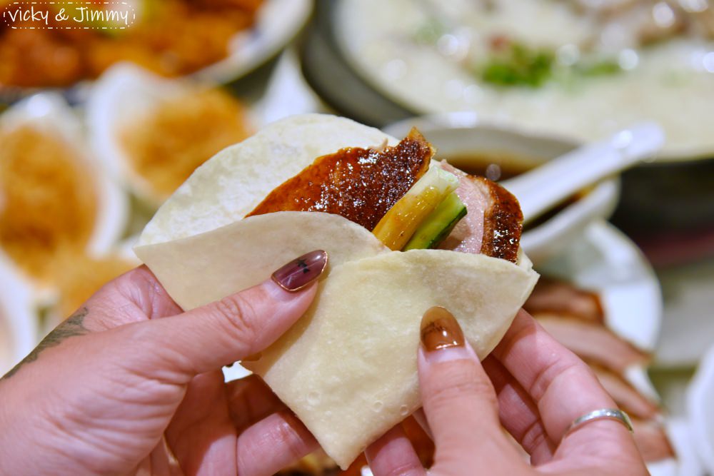 外皮會比一般的北京烤鴨再深一些,鴨皮烤的脆脆的,每咬一口都聽得見咔滋聲。