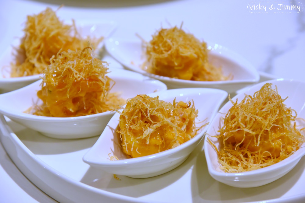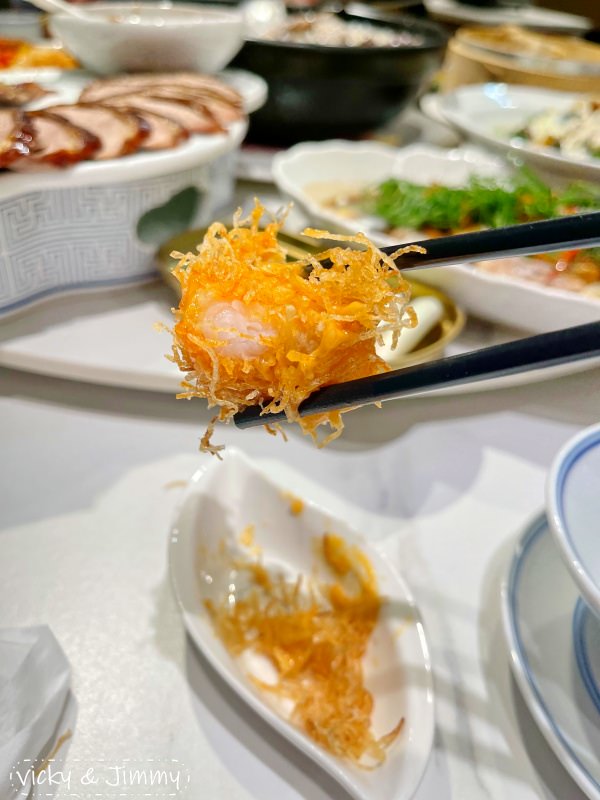 以新鮮馬鈴薯刨絲,先炸過,再以主廚特製酸甜醬汁裹住酥炸鮮甜草蝦,